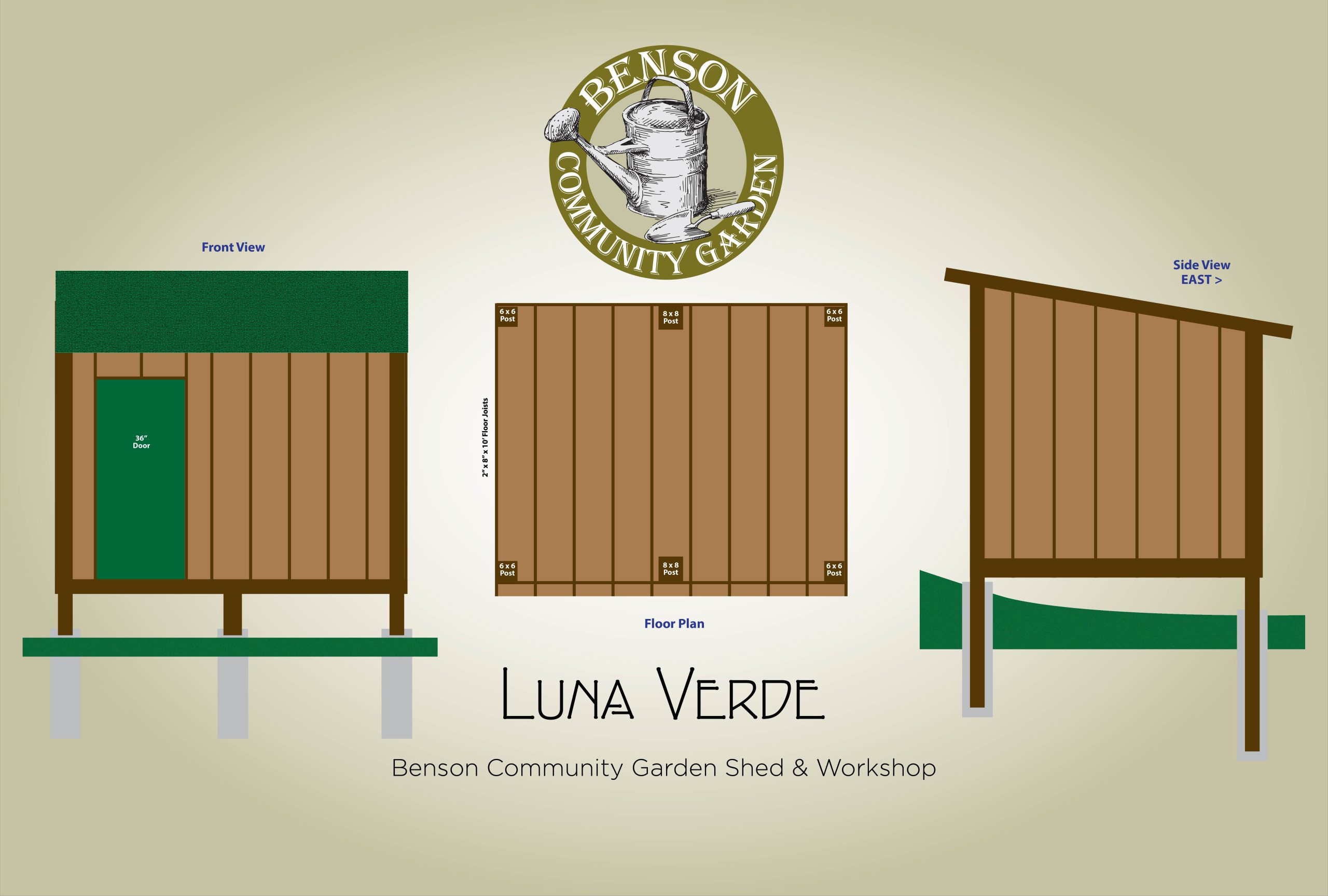 Luna Verde will be built on six ground-set posts (48 inches deep), with a raised floor and a roof sloped from west to east. You can help in several ways: